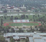 in 1949. The old cinder track circling the football field was replaced